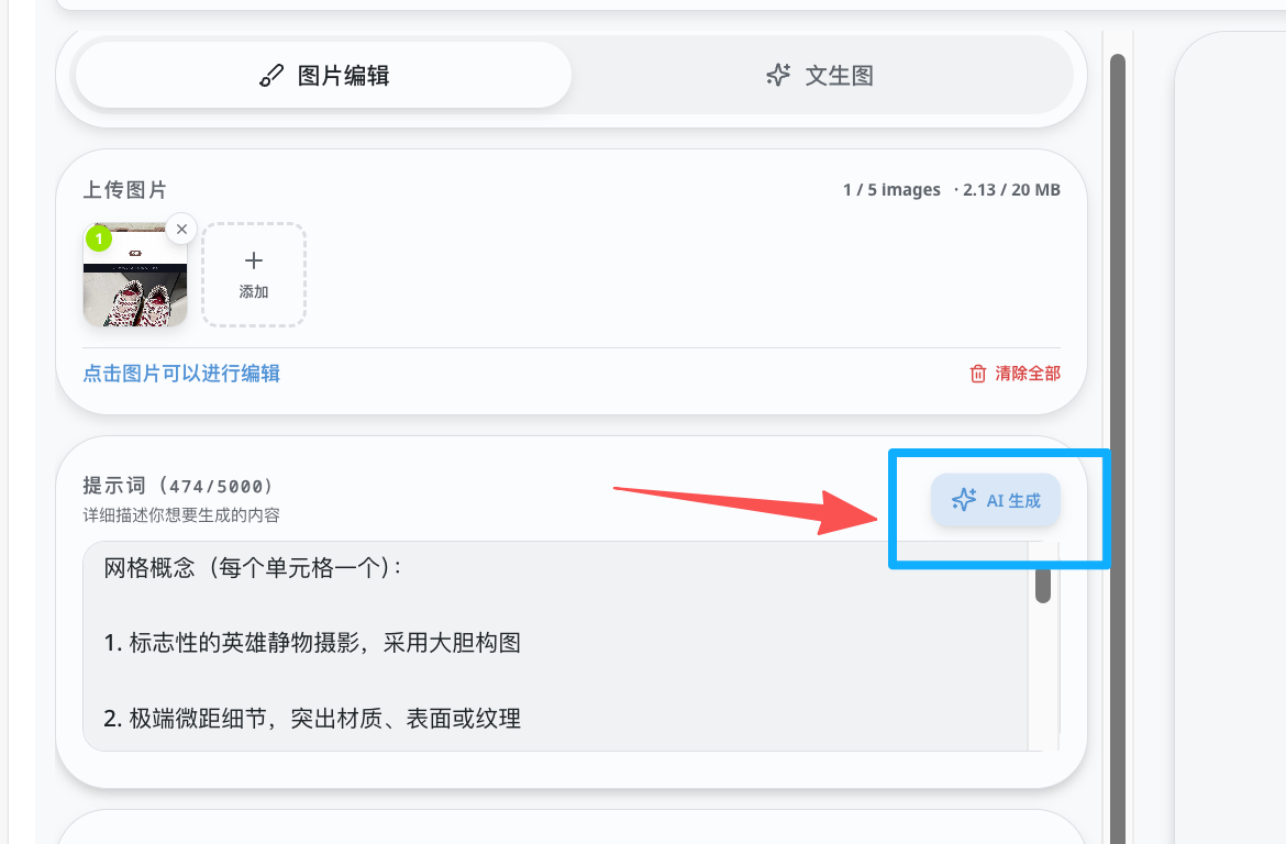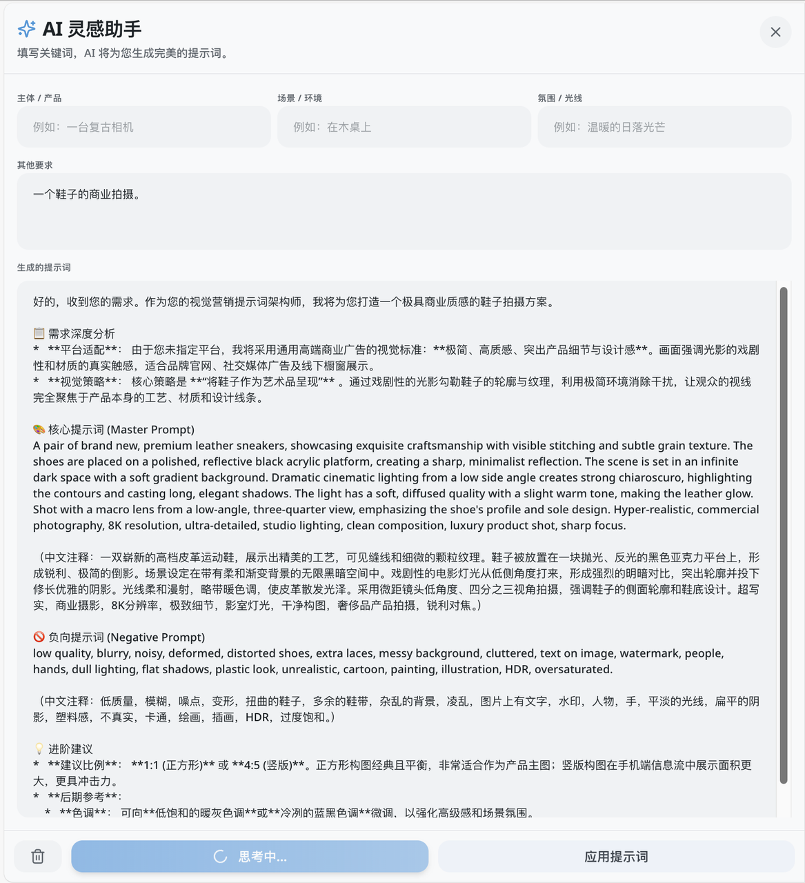 AI 润色: 点击"AI 润色"按钮,系统会将您的口语转化为专业级图像指令。