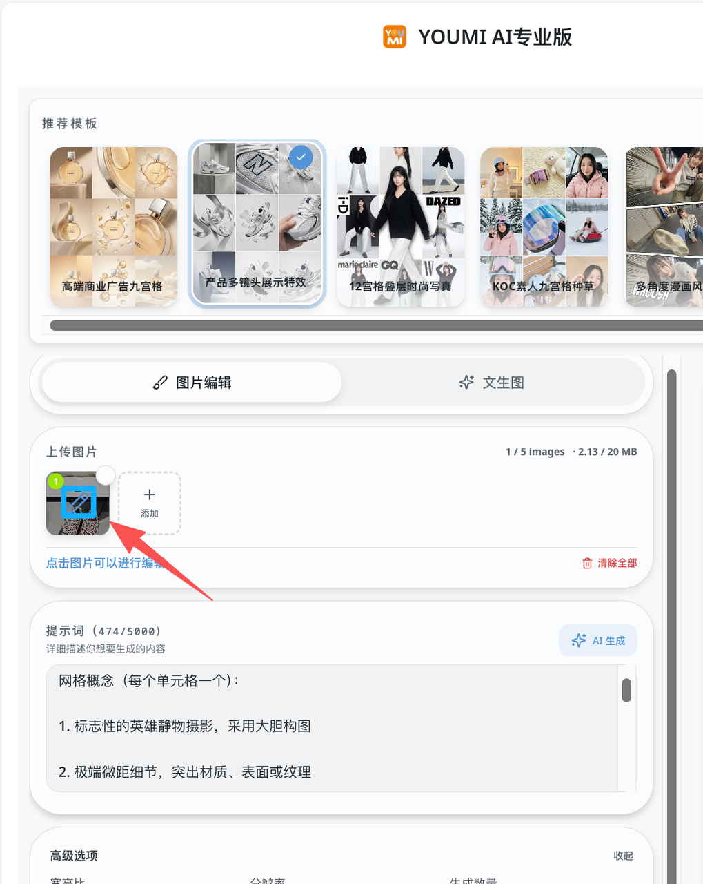 - 选风格: 在模板库点击心仪的案例/直接上传图片,填写提示词。